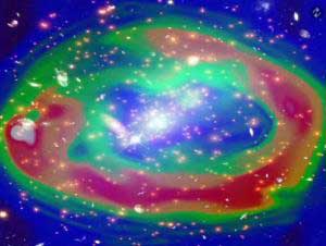 不過,有一個(gè)事實(shí)是確定無疑的:大自然已經(jīng)將星系團(tuán)轉(zhuǎn)變成了一個(gè)強(qiáng)大的粒子加速器,其功能要比目前歐洲粒子物理研究所的巨大核強(qiáng)子碰撞器強(qiáng)大20倍。研究組成員斯蒂芬-帕爾塔尼說:“當(dāng)然,與之相比,蛇夫座星系團(tuán)要大得多,巨大核強(qiáng)子碰撞器的直徑是27公里,而蛇夫座星系團(tuán)的直徑有200萬光年。”目前世界上功能最強(qiáng)大的人造核粒子加速器位于歐洲粒子物理研究所在瑞士粒子物理實(shí)驗(yàn)室創(chuàng)建的“巨大核強(qiáng)子碰撞器”。正如恒星與行星起源于松散的塵埃和氣體云團(tuán)一樣,星系也是起源于大得多的凝結(jié)塊。當(dāng)星系在空間移動(dòng)時(shí),自身巨大的引力將持續(xù)拖動(dòng)環(huán)繞周圍的塵埃及氣體云。當(dāng)它們發(fā)生碰撞或凝結(jié)成團(tuán)時(shí),產(chǎn)生的巨大能量將壓縮和加熱云團(tuán)。