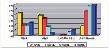 圖1 所示從1999年到2002年(2002年的數(shù)據(jù)是由上半年數(shù)據(jù)推算而來)單探頭、雙探頭、雙探頭帶定位系統(tǒng)和多探頭符合線路,四種不同核醫(yī)學設備每年各種類型所占比例?梢钥闯觥W顬槊黠@的是普通雙探頭在2002年僅僅占總數(shù)的5%,普通單探頭占總數(shù)25%,多探頭帶符合電路系統(tǒng)占總數(shù)59%。普通雙探頭帶X線定位系統(tǒng)占總數(shù)10%?梢钥闯鰡翁筋^SPECT和多探頭符合電路系統(tǒng)呈增長趨勢,尤其以多探頭符合電路系統(tǒng)更為明顯。