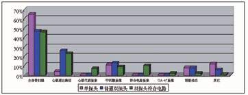 圖2 從2001年7月-2002年6月調研10家單探頭用戶、5家普通雙探頭用戶和30家雙探頭可變角度帶有符合電路用戶臨床檢查類型的數(shù)據(jù)。為了便于比較,采用相對數(shù)的方法?梢钥闯鰧τ趩翁筋^用戶在臨床主要用于骨掃描和甲狀腺檢查。對于雙探頭帶有符合電路系統(tǒng)的用戶,骨掃描46%、心肌血流灌注23%、符合電路10%、甲狀腺9%、心肌代謝7%、GA-67為2%,其它(腎臟、肝等)3%?梢钥闯鲭p探頭符合電路系統(tǒng)最大的貢獻是為臨床開拓出20%新的檢查項目,最為重要的是這些檢查項目將成為主流臨床檢查。這可能是雙探頭(多探頭)符合電路在國內(nèi)急劇增加的主要原因。