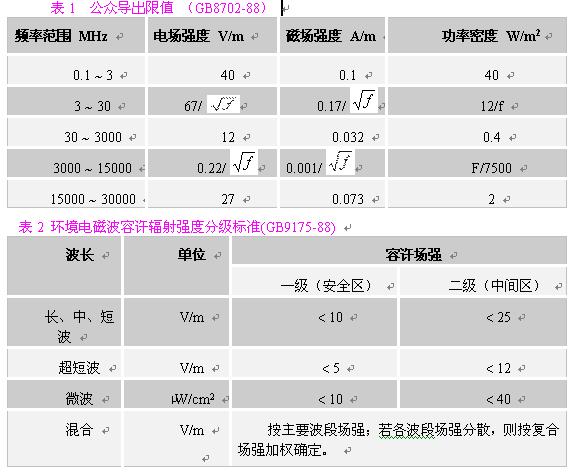 在對一般環(huán)境的電磁輻射分析中,應(yīng)主要選用《環(huán)境電磁波衛(wèi)生標(biāo)準(zhǔn)》主要選用《環(huán)境電磁波衛(wèi)生標(biāo)準(zhǔn)》(GB9175-88),根據(jù)輻射源的主要輻射頻率,參照表2,找到其輻射強(qiáng)度限值。注意掌握三個(gè)標(biāo)準(zhǔn)限值,一般我們把居民居住的環(huán)境按一級安全區(qū)處理,則其標(biāo)準(zhǔn)限值為:在長、中、短波,電場強(qiáng)度應(yīng)小于10V/m;在超短波段,電場強(qiáng)度應(yīng)小于5V/m;在微波波段,其輻射功率密度應(yīng)小于10μW/cm2?紤]到對在電磁輻射環(huán)境內(nèi)工作人員的保護(hù),我們建議在職業(yè)安全衛(wèi)生領(lǐng)域,采用《電磁輻射防護(hù)規(guī)定》(GB8702-88)的相應(yīng)限值。